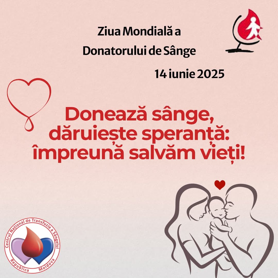 În contextul celebrării ,,Ziua internațională a Donatorului de Sânge - 14 iunie", Vă îndemnăm pe toți cetățenii de bună credință să participați la activitățile de donare de sânge, contribuind la salvarea vieții unui copil nou-născut, unei mame, unui tată, unui frate sau surori.